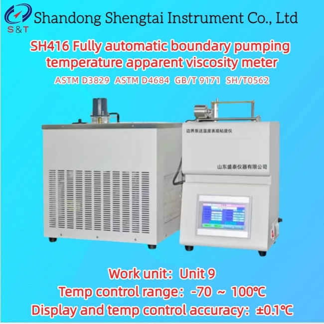 SH416 সম্পূর্ণ স্বয়ংক্রিয় বাউন্ডারি পাম্পিং আপাত সান্দ্রতা মিটারটি চীনা জাতীয় স্ট্যান্ডার্ড GB/T 9171-1988 ইঞ্জিন অয়েল বাউন্ডারি পাম্পিং তাপমাত্রা নির্ধারণ পদ্ধতি, সেইসাথে SH/T0562-এর প্রয়োজনীয়তা অনুযায়ী ডিজাইন ও তৈরি করা হয়েছে এবং এটি পেট্রোকেমিক্যাল শিল্প স্ট্যান্ডার্ড ASTM D3829 D4684 পূরণ করে; এটি -5 ℃ থেকে -40 ℃ পর্যন্ত বিস্তৃত তাপমাত্রা নিয়ন্ত্রণ পরিসীমা সহ মোটর গাড়ির ইঞ্জিন তেলের বাউন্ডারি পাম্পিং তাপমাত্রা, (নিম্ন তাপমাত্রা) ফলন চাপ এবং আপাত সান্দ্রতা নির্ধারণের জন্য ব্যবহৃত একটি যন্ত্র। পুরো পরীক্ষামূলক প্রক্রিয়াটি কম্পিউটার দ্বারা স্বয়ংক্রিয়ভাবে নিয়ন্ত্রিত হয়।