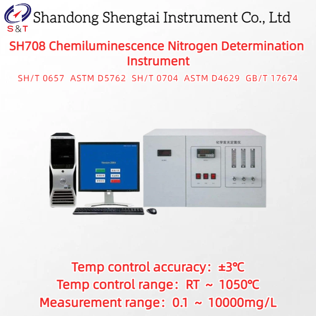 SH708 কেমিলুমিনেসেন্স নাইট্রোজেন বিশ্লেষক মোট নাইট্রোজেন উপাদান নির্ধারণের জন্য কেমিলুমিনেসেন্স পদ্ধতি ব্যবহার করে, যা অশুদ্ধি হস্তক্ষেপ প্রতিরোধের ক্ষমতা উন্নত করে এবং কুলোমেট্রিক পদ্ধতির কারণে টাইট্রেশন সেলের জটিলতা এবং এর ফলে অস্থির কারণগুলি এড়িয়ে যায়, যা যন্ত্রের সংবেদনশীলতা অনেক বাড়িয়ে তোলে। সিস্টেমের মূল উপাদানগুলি আমদানি করা উপাদান ব্যবহার করে, যা পুরো মেশিনের নির্ভরযোগ্য কর্মক্ষমতা নিশ্চিত করে। প্যারাফিন তেল, ডিজেল, পেট্রোল, লুব্রিকেটিং তেল, জ্বালানি তেল, তরল গ্যাস এবং প্রাকৃতিক গ্যাস, সেইসাথে অন্যান্য তেল পণ্য, রাসায়নিক কাঁচামাল এবং সমাপ্ত পণ্যের মোট নাইট্রোজেন উপাদান নির্ধারণের জন্য প্রযোজ্য, SH/T 0657 তরল পেট্রোলিয়াম হাইড্রোকার্বনে ট্রেস নাইট্রোজেন নির্ধারণ (অক্সিডেটিভ কম্বাসন এবং কেমিলুমিনেসেন্স পদ্ধতি, ASTM D5762-2017, SH/T 0704, ASTM D4629, GB/T 17674 ক্রুড অয়েলে বোট ইনজেকশন কেমিলুমিনেসেন্স পদ্ধতির মাধ্যমে নাইট্রোজেন উপাদান নির্ধারণ) স্ট্যান্ডার্ড অনুযায়ী।