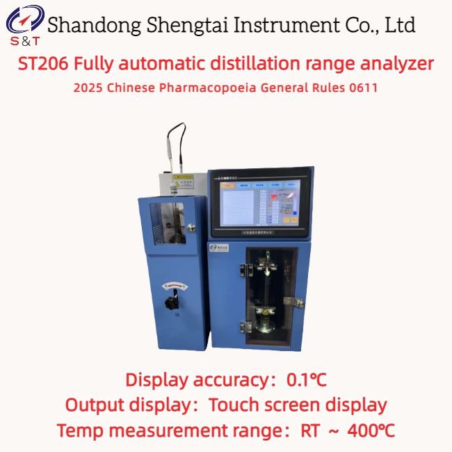 ST206 সম্পূর্ণ স্বয়ংক্রিয় ডিস্টিলেশন রেঞ্জ বিশ্লেষক একটি রঙিন এলসিডি ডিসপ্লে স্ক্রিন, চীনা মেনু মানব-মেশিন কথোপকথন, গাইডেড অপারেশন এবং সম্পূর্ণ স্বয়ংক্রিয় পরিমাপ প্রক্রিয়া বৈশিষ্ট্য।২০২৫ চীনা ফার্মাকোপিয়ার সাধারণ নিয়ম ০৬১১ এর ডিস্টিলেশন রেঞ্জ নির্ধারণ পদ্ধতির প্রয়োজনীয়তা অনুসারে ডিজাইন করা হয়েছে, ডিস্টিলেশন পরিসীমা নিম্নলিখিত পদ্ধতি অনুসারে ডিস্টিল করা তরলের তাপমাত্রা পরিসীমাকে বোঝায়, স্ট্যান্ডার্ড বায়ুমণ্ডলীয় চাপ [101.3kPa (760mmHg) এ ক্যালিব্রেট করা হয়,পঞ্চম ফোঁটাটির দ্রবীভূতকরণের শুরু থেকে যতক্ষণ না মাত্র ৩-৪ মিলি বা পরীক্ষামূলক নমুনার ভলিউমের একটি নির্দিষ্ট অংশ দ্রবীভূত হয়.